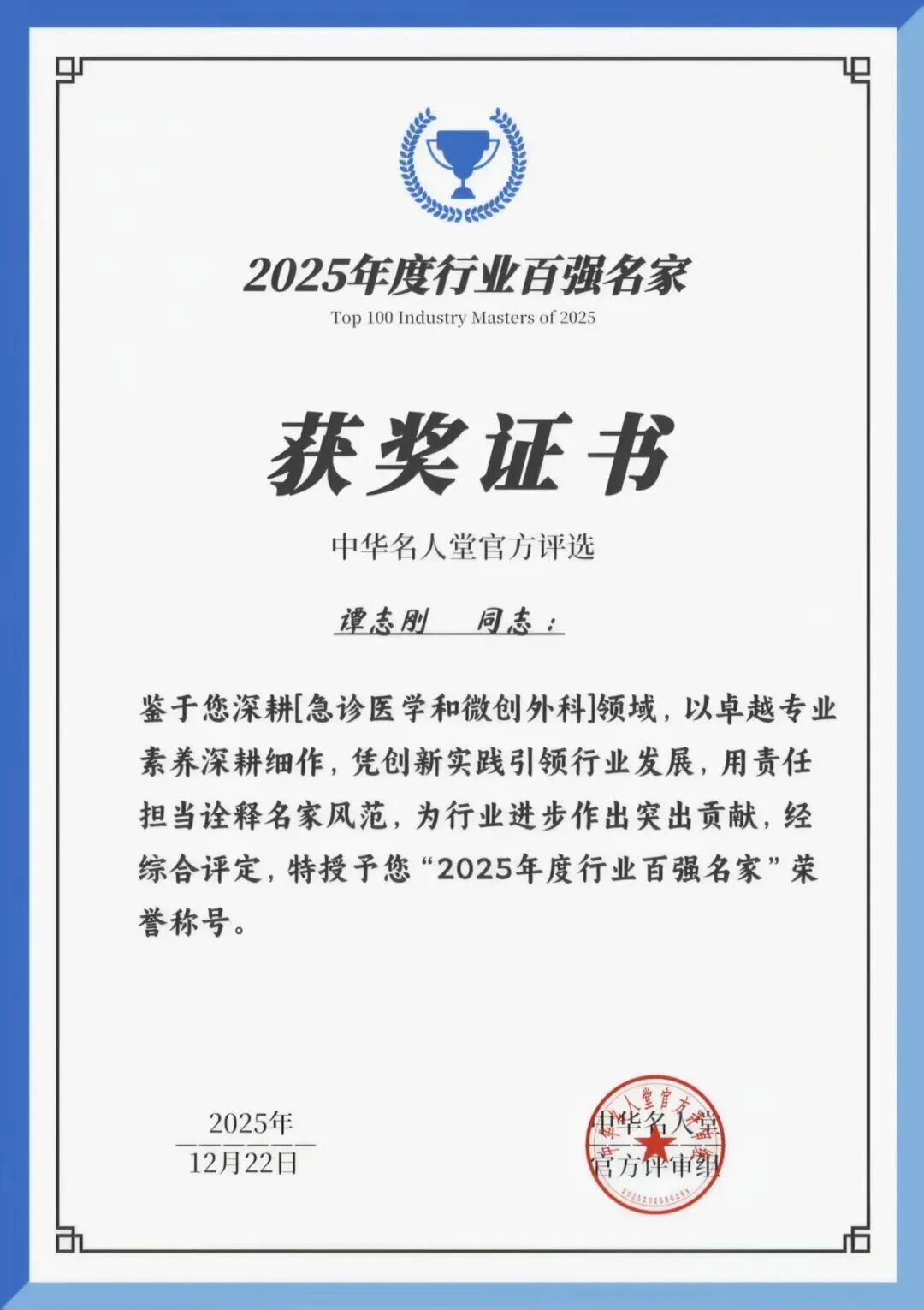2011年度“医圣杯”全国优秀医务工作者,2022年度中国医疗行业百名杰出人物,2024年获评中国移动医大手术平台微创外科专家,2024年荣获第四代肠转流优化术式治疗2型糖尿病传承人资质认定,2025年度[急诊医学与微创外科]行业百强名家。发表医学学术论文30余篇,多次荣获国家级、省市级科研成果奖。
